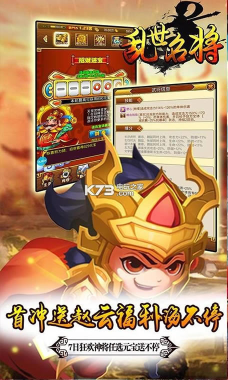 《乱世名将无限版》是一款全新的策略回合卡牌对战游戏。上线送15000元宝、送橙色武将、送百万铜币。上线送满V,经典画风、武将、专属战斗动作、傲娇对话独白、演绎Q萌新境界。