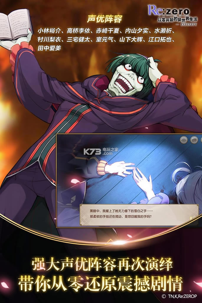 《re从零开始的异世界生活infinity》手游会保留动漫的精髓,1:1复刻还原人物、场景和剧情,并邀请动漫cv的原班人马为人物、剧情做全新的配音,在视觉和听觉感受上都达到完美还原。