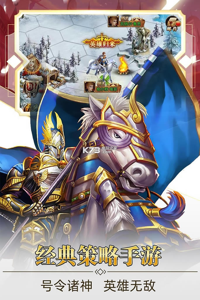 守护英雄传说--魔法与策略,玩家可以领导浩大军队,彼此结盟、对抗、贸易,最终成就英雄的传奇。六边形经典网格,同时游戏创造性的将众多知名英雄合理的融入到战棋玩法中,让游戏耳目一-新,与众不同!游戏涵盖了卡牌收集、英雄养成、竞技pk、副本冒险、魔法技能收集、兵种收集等诸多玩法,游戏性极强,百玩不厌!