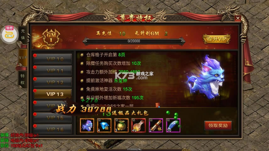 ★上线就送战宠满阶直升丹,还免费赠送100%麻痹特权,轻松挑战所有BOSS