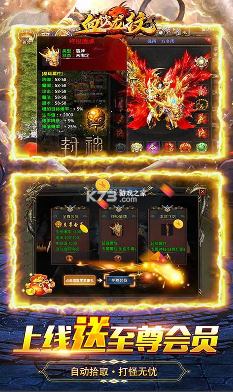 ★上线即送至尊会员:100%爆率+自动一键拾取!终极盾牌:领取即终极,酷爽开局!本命飞剑:超强神器,发展快人一步!上线即可领取!