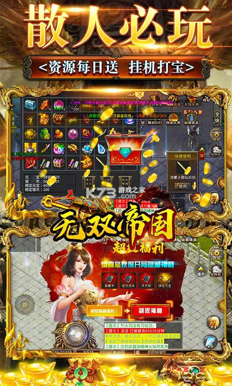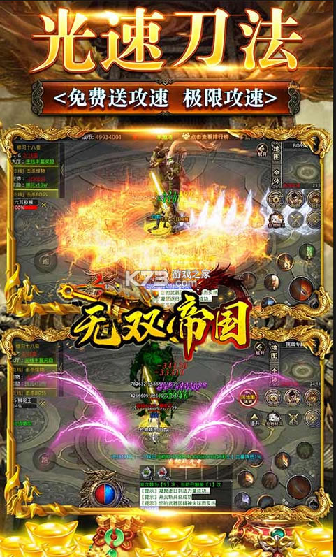 《无双帝国》打造西游的特色传奇,西游剧情玩法超级出色,送时装送神器送终极盲盒,福利爽翻天,特色剧情的版本,全屏爆装神装全靠打,自由的交易,散人必玩,挂机打宝,资源每日送,福利超级多,玩家们耳熟能详一秒读懂。