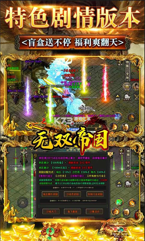 无双帝国(三千大世界)是一款纯正复古打金高爆传奇,携三千仙侠大世界盛大降临,圣墟、星辰变、斗破还原小说剧情,让你体验主角闯荡四方的爽快,每个专属都有各自特色,佛怒火莲、24异火、神秘石盒,自由搭配,拒绝枯燥单调玩法