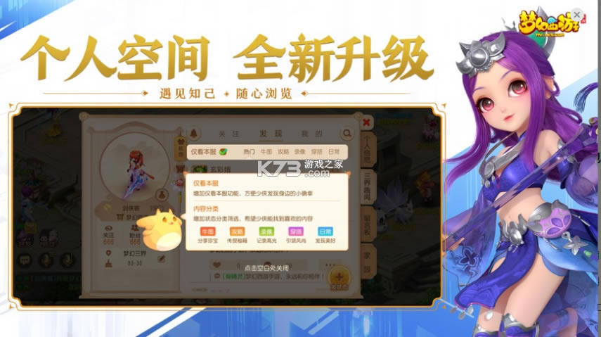 个人空间迭代升级,多元空间随心浏览,分享趣事留住美好。梦幻百晓阁惊喜开放,共享三界万千奇遇,梦幻纪年回顾剧情。