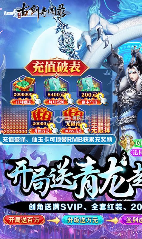 ★【创角福利】:上线送满SVIP、神兽青龙、全套红装、200万仙玉、500万元宝、5亿银币、极品称号、华丽翅膀