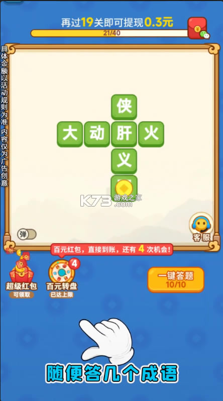 全新的良心猜成语赚钱游戏,完成成语的填空,随便答几个成语就能提现了,每天都可以玩,只要会成语都可以来参加,可以真正赚钱领红包的游戏,谁会错过呢