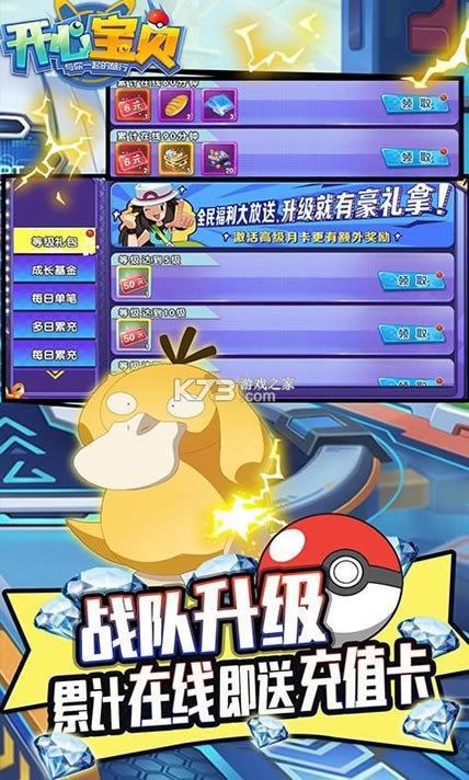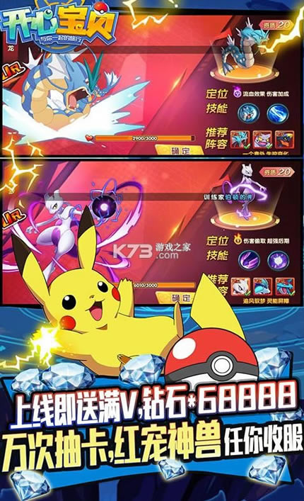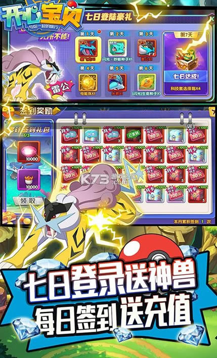 《开心宝贝》宝可梦题材幻想的元素,多样的玩法,融入到战斗的沉浸感中,独特舒适更加方便,提升自我的欲望元素,上线送万元真充卡,完成每日任务,一键自动刷新副本,每日领豪礼,七日登录,每日领30充值卡,福利多多尽情畅玩。