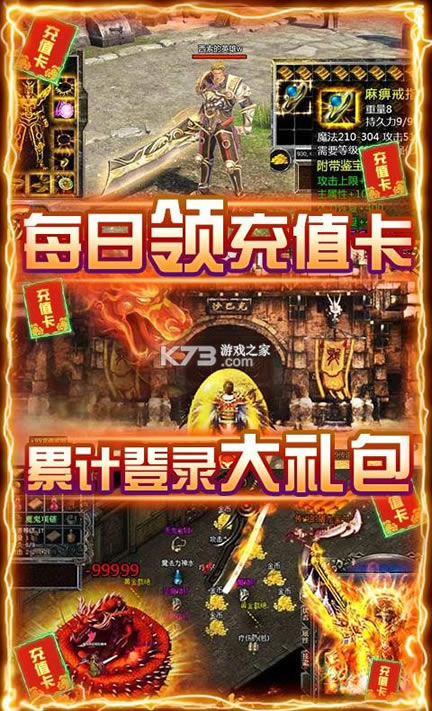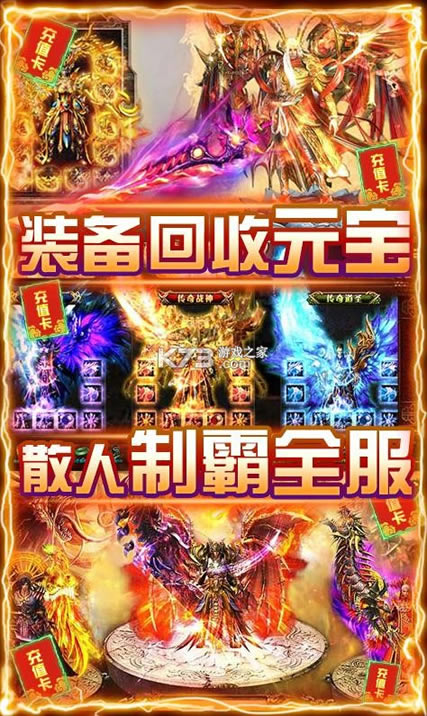 自由PK,体验杀戮快感,练级、打宝只为站在沙巴克的城墙!新增多种玩法:夺宝奇兵、盘古之地、皇族秘宝,增加不一样的感受九种职业组合、六大合击技能,首领刷不停,装备全靠打,散人打金,土豪激情