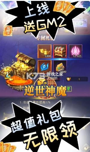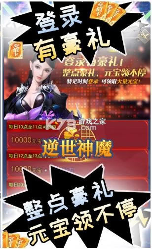 《逆世神魔》上线领取无限的元宝,上线送GM2,10连抽以及超值礼包,仙魔和灵族随意的切换,怀抱美人在虚构的修真世界中尽情的战斗,用最时尚的理念来训练兵,战力飙升百万,豪华珍奇宝物一起进入游戏领取吧。