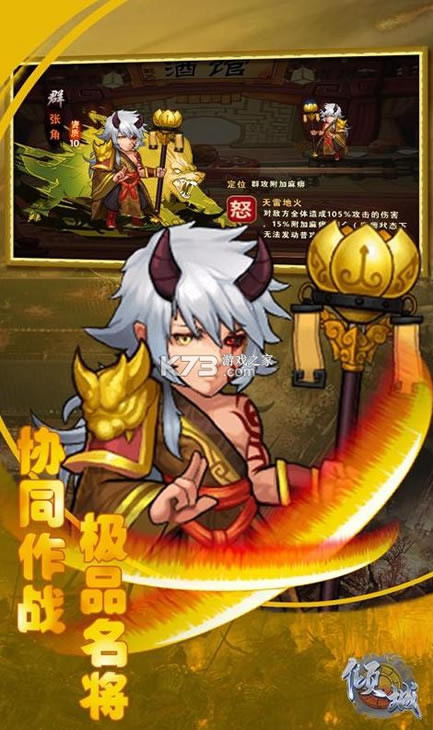《倾城》全新的国战游戏,开启三国的征战之路,培养武将不断的进阶和突破,解锁新的区域和获得更多的资源,各个属性间相互克制,充分展现战队的实力,释放超强的必杀技能,解锁不同的装备,海量材料免费领轻松击败对手们。
