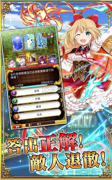 『演艺』、『文科』、『理科』、『动漫和游戏』、『体育』、『生活常识』等六大类型题目供玩家选择,正确答题将唤醒沉睡中的精灵,给予敌人痛击!