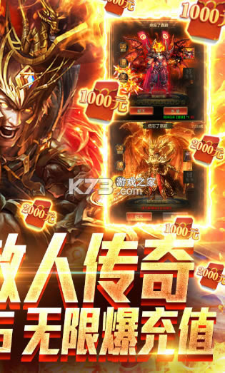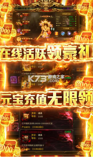 开始真正的传奇之战,走进这个传奇世界,尽情的战斗升级,各种神装道具可以领取,辅助角色进行战斗pk,还有各种充值返利的活动可以参与,强大自己的角色,闯荡各种副本,开启你的传奇之路,逐步的升级,成为真正的传奇王者,各种高概率的副本模式可以尽情选择,开始你的战斗升级,得各种极品装备.