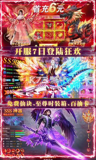 5.开服7日登陆狂欢,免费仙诀、至尊时装箱、宝石箱、百抽卡。