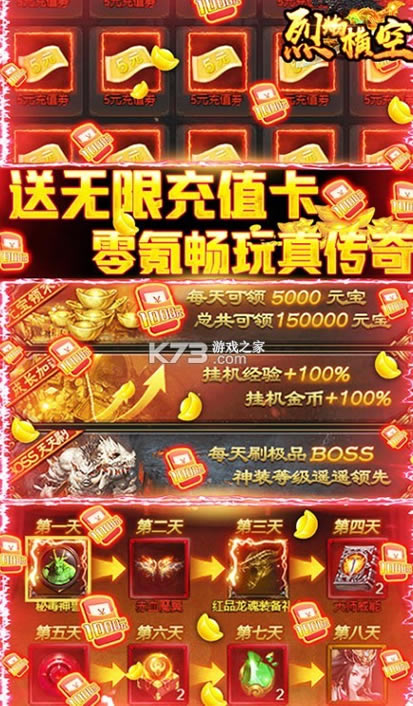 每日登录免费再送真充卡,无限领取!副本通关大量爆充值卡,走到哪爆到哪!零氪玩家的真爱传奇!在这款游戏里你能体验到英雄的铁血柔情,谁说传奇故事只有血洒疆土?
