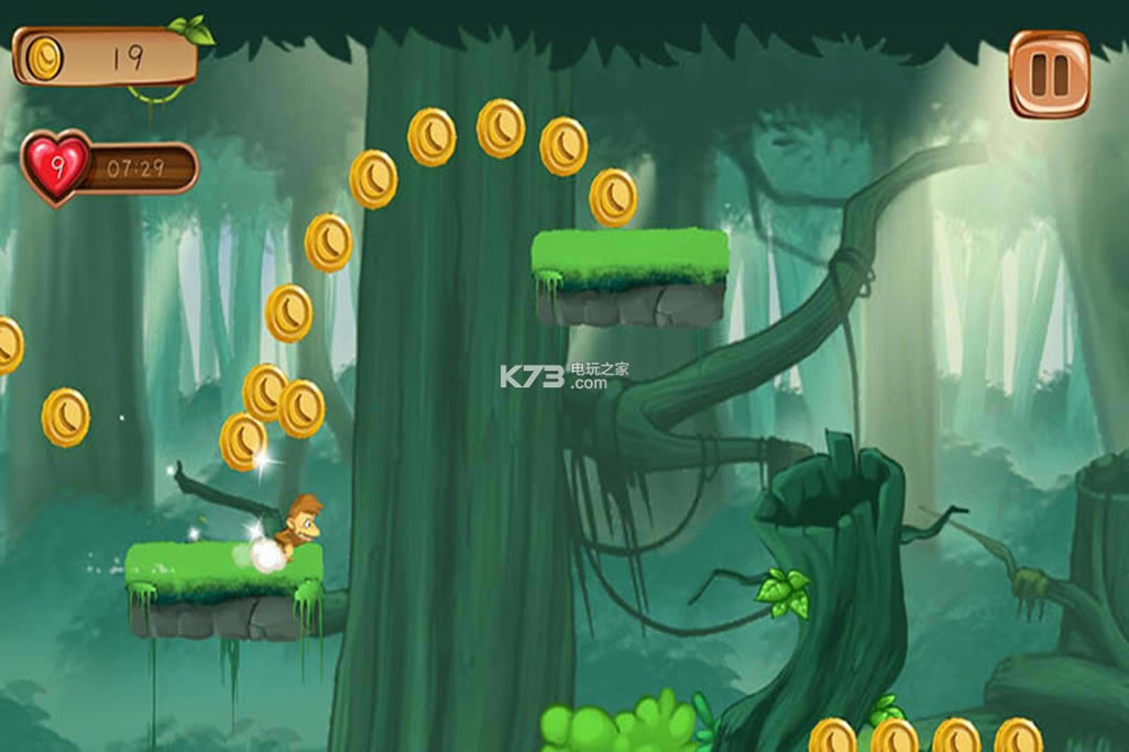 森林岛大冒险是一款横版过关游戏,操控小猴躲避关卡中的机关陷阱,还有老猴子的攻击,将金币全部收入囊中,要想收集齐所有的金币需要你拥有非常快速的反应能力。