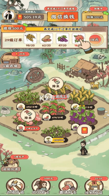 1、经营田园,用心种植农产品,等它们成熟之后收割出售,还能获得红包奖励