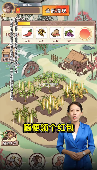 1、管理花园,精心种植农产品,成熟后收获并出售,并获得红包奖励