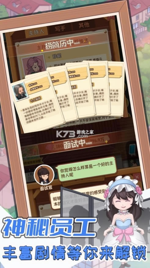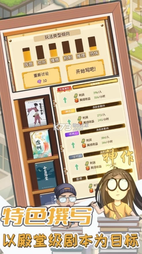 最新的经营模拟游戏,玩家要在游戏中经营一家剧本馆,将时下流行的剧本杀打造成经营游戏,非常有趣,玩家需要不断研制出新的剧本,吸引更多顾客的到来,同时还可以装饰自己的店铺,玩法多样