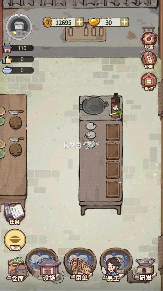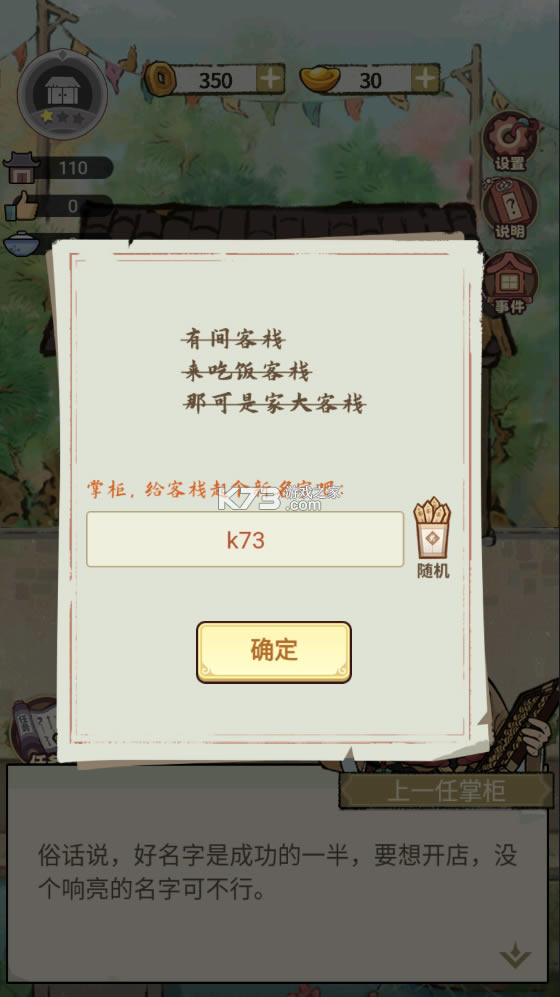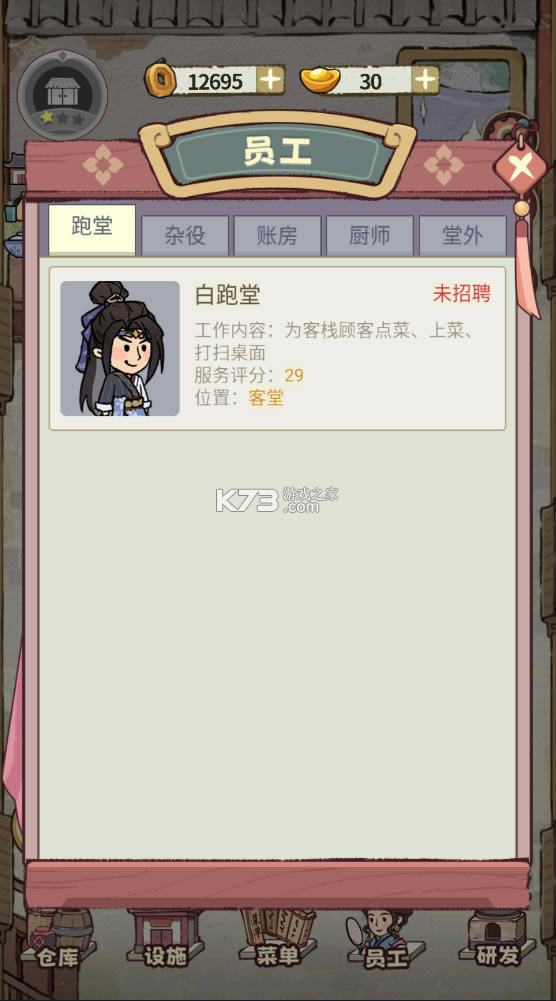古风打造经营游戏,放置的玩法,十分有趣的经营模式,在这里你可以自由体验,享受当老板的乐趣,管理一家属于你的客栈,招募小二等伙计以及厨师,推出各种菜肴,吸引客人,让你赚取元宝
