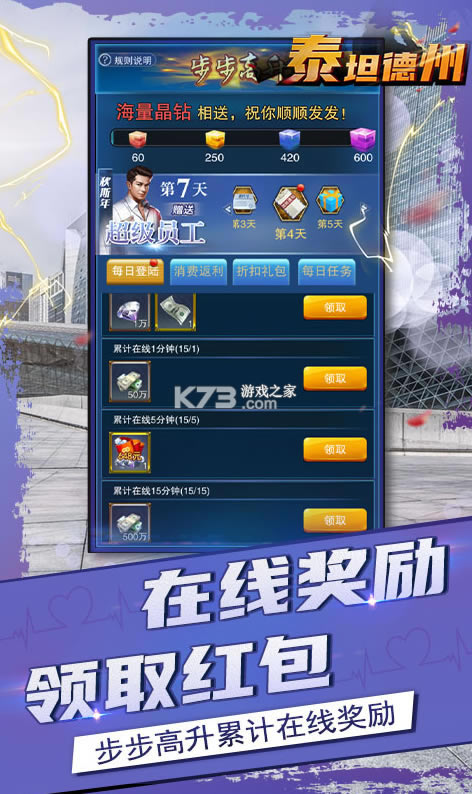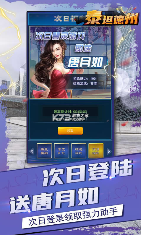 《泰坦德州》在线奖励领取红包,首充即可送第一员工,送强力的助手,福利多多签到领奖励,福利超级多,打造全新的成就系统,丰富的道具和全新的玩法,每日登录在线福利超级多,开启商业经营的游戏,带领你来叱咤商战的风云。