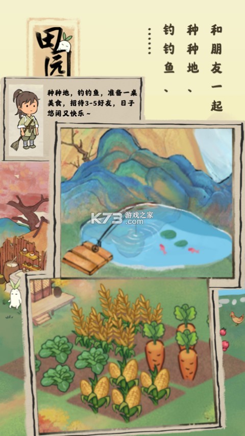 一款画面充满古风的田园模拟类游戏,游戏中的各种钓鱼玩法等你去感受,玩家还可以收集很多的材料去做饭,享受真正的田园生活,很多农作物也可以去种植!