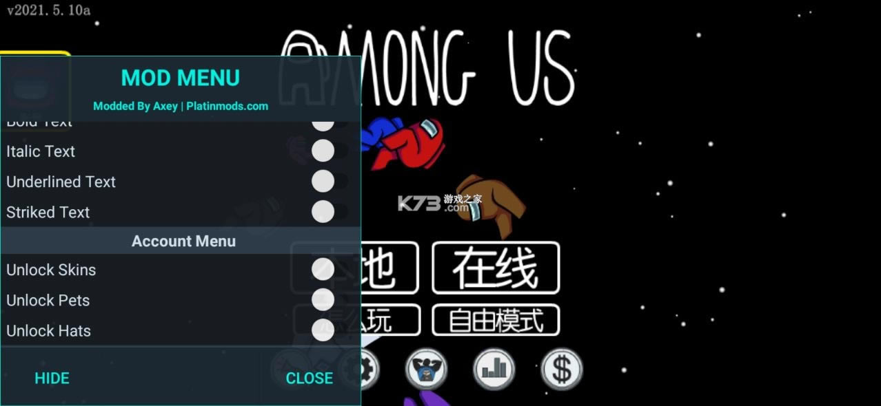 《在我们之间汉化版(mod菜单)》是提供了汉化的mod菜单的一个手机版本哟,想要开启什么作弊功能都可以来点击打开了,超多的破解选项支持的一个版本,让你进行更多破解体验,超多物品直接解锁。