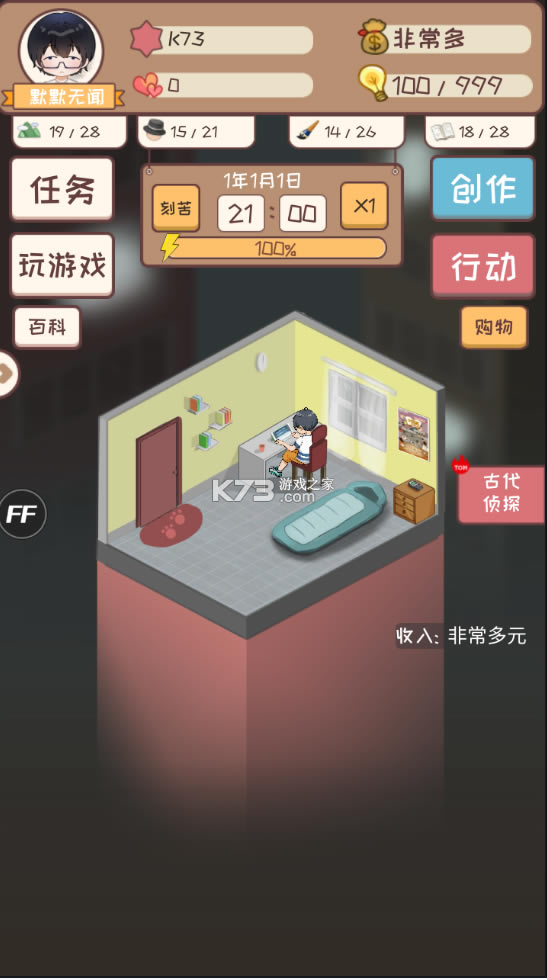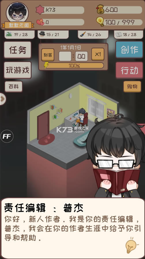 一款贴合生活实际的模拟养成类手游,该游戏以盘点网络小说家的生活写照为主要进程玩法,玩家在此所扮演的网络小说家,将依照故事取材来写出畅销网络的小说书籍,时则当下热门题材,并选择合理的搭配效果,会对小说的评分和后期更新造成一定的影响,这样便可在创作的过程更容易出现杰作!游戏中所谓玩家们提供的题材非常丰富,从古代历史到现代文明,从太空、宫廷、经商到怪兽、玄幻,优雅的选择创作题材,可让由无人问津的网文作品突变为爆红网络的极品佳作,另外关于该游戏的详细玩法