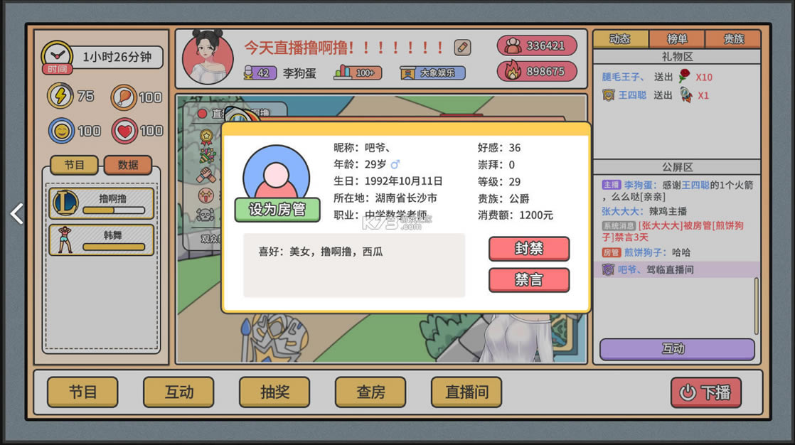 粉丝:想成为一名顶级主播,对粉丝的运营至关重要,尤其是那些土豪们,你在微聊里面会有个粉丝群,你可以将刷了一定数额礼物的粉丝拉进群里,没事互动一下,增进粉丝粘性;那些特别豪气的粉丝你也可以单独加微聊,他们有时候可能会提出一些过分的要求,选择金钱还是选择尊严,你说了算。当然,游戏是自由的,如果你被惹恼了,你可以直接从微聊里删除对方,然后在直播间里也可以将其永封,你可以成为一名特立独行的存在,直播间所有粉丝,土豪,你都可以对他们进行各种互动,只要你想,哪怕是你的榜一,你也可以直接将其禁言与封禁,你可以给任何你喜欢的粉丝房管,并随时撤掉,可以随意任何一个粉丝的微聊,并随时删掉; 不过这些任性的行为可能会导致那些被你伤害过的粉丝不再支持你,再也不给你刷礼物,甚至成为你的黑粉。除此以外,你还可以自定义你专属的粉丝牌昵称,以及给自己的粉丝团取名等等