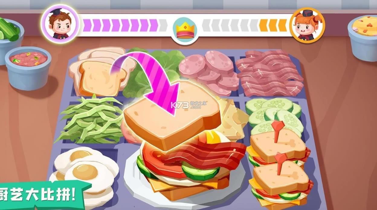 参加各国菜肴比拼:西餐、中餐、日式料理......哪一种是你最擅长的,快来试试吧!按顺序加入培根、奶酪、黄瓜、西红柿,制作特色口味三明治。寿司做好了快把它们摆放到盘子里,摆盘要精致哦!