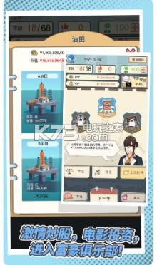 玩家投身全民商战的狂潮,白手起家,开店铺、建工厂、招募精英人才、定制豪车游轮、开发房地产、资本运作,合理规划,建立起生产、销售一体的实业王国,成为玩转资本市场的世界名流。