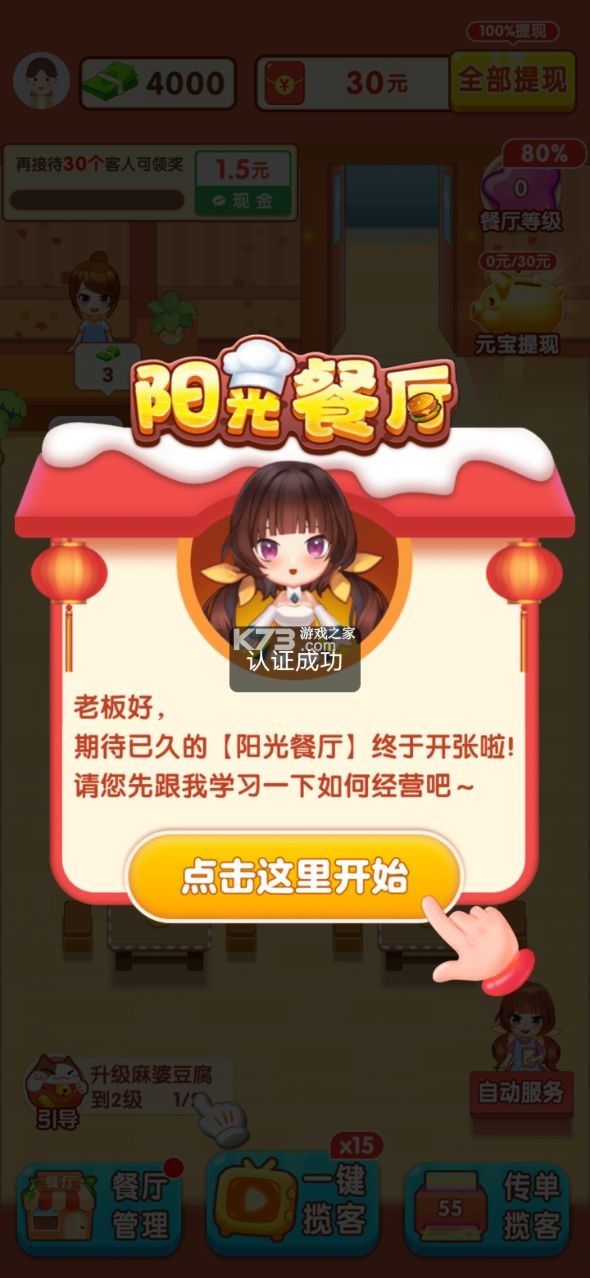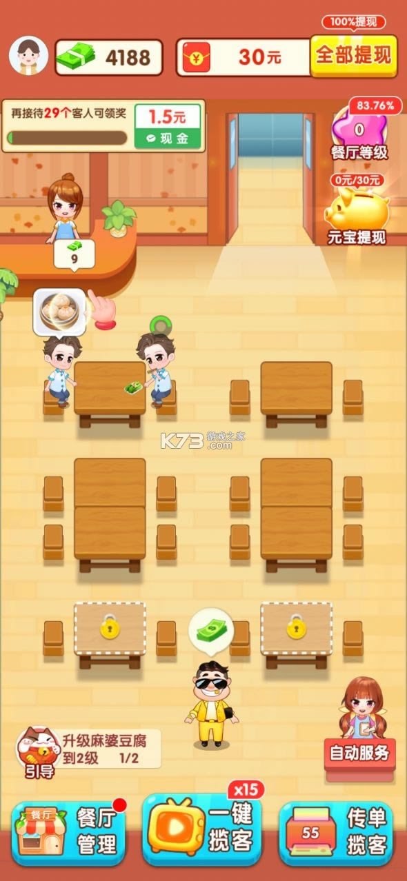 《阳光餐厅红包版》是款支持来经营一个阳光高级的餐厅的手机游戏了,更多的红包通过经营一个餐厅来获取,可以来查看最新的新手指导,让你快手领取新手红包的游戏了。真实赚钱的阳光餐厅,快来安装吧!