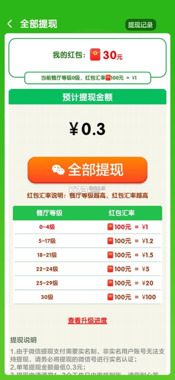 新人享有一次0.1元的提现机会,之后最低则是需要100元才可以提现。事实上玩家在游戏中首次获得红包是最多的,通常是几元钱,这也就很容易达到最低提现门槛。