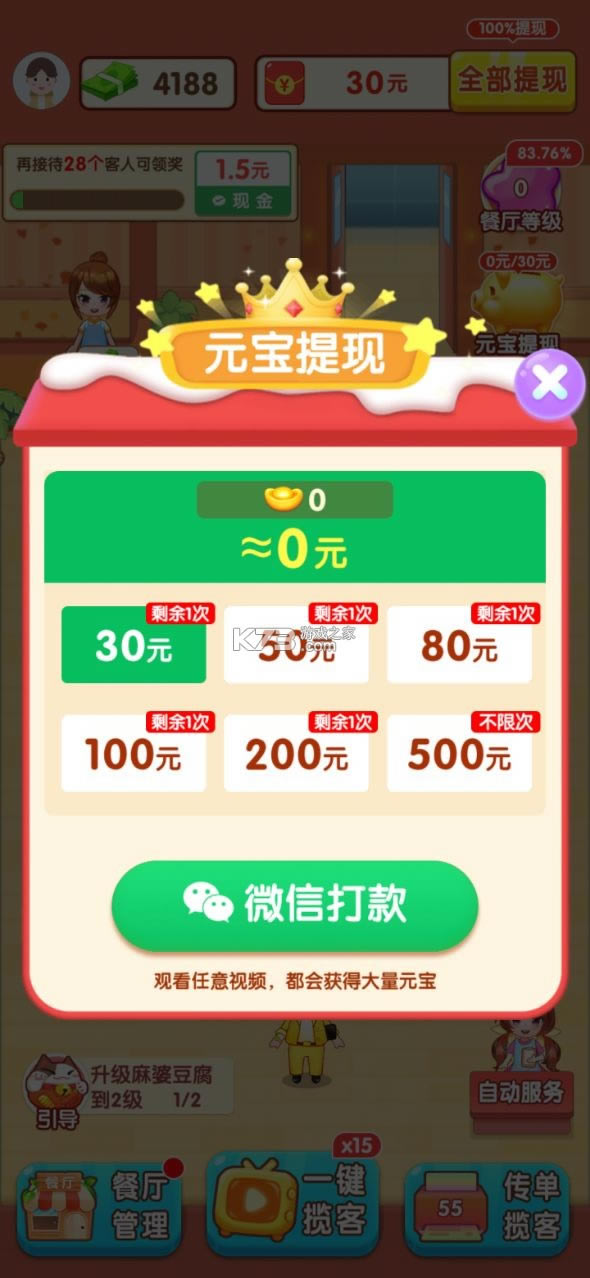 主要的赚钱来源就在于顾客每次结账时,会赠送我们一定的“小费”,小费是红包的形式到我们游戏账户中的,通过看视频可以让红包金额翻倍,其余赚钱方式还有参与厨神大赛,或者是领取红包雨;
