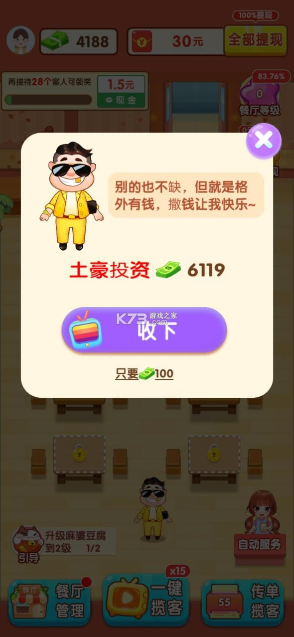 5、在游戏中,你可以获得完成任务和升级餐厅的红包,这很简单;