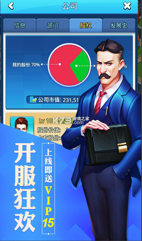 从10级开始,升级过程就没那么顺利了,可以先去公司-股权界面下进行一次分红,10万G币就够了,分完可以获得一个信用勋章,能增加20%的店铺预收入,作用非常大。