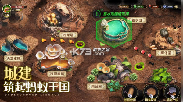 还会发现浸透的泥潭、掉落的流沙等,这些都是修补巢穴不可或缺的资源!探索地下世界,从无到有建设你的蚁国,蚁巢中各种建筑资源囊括蚂蚁日常生态的各种环节,你可建设各类资源采集地,为蚁巢发展提供巨大容量的存储仓库,建造旅行虫栖息地,与外来的瓢虫交易巢内多余资源;还能建设工蚁栖息地,为忙碌的生产提供更多的后备蚁...