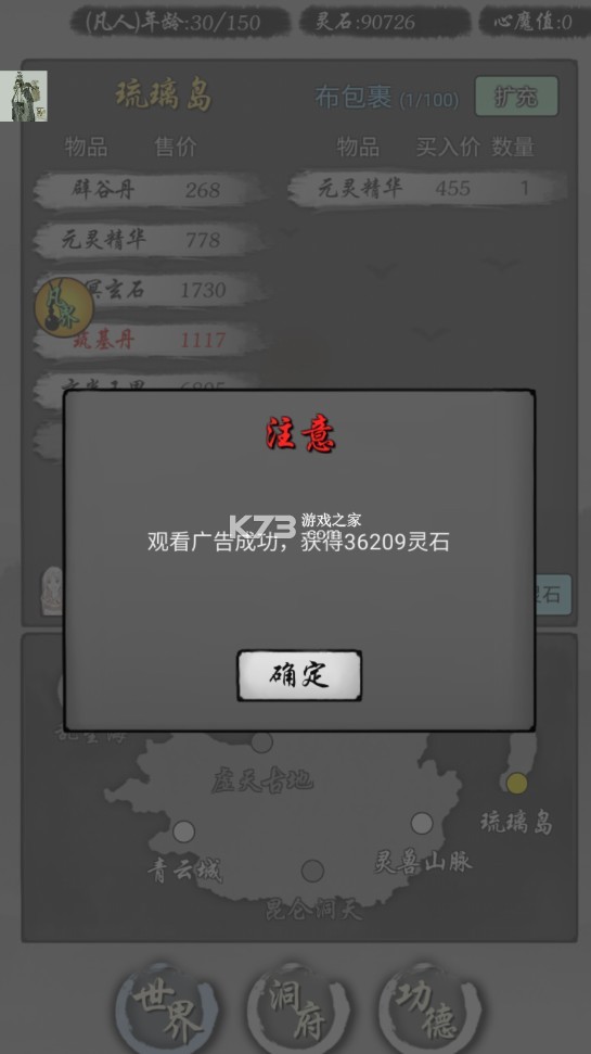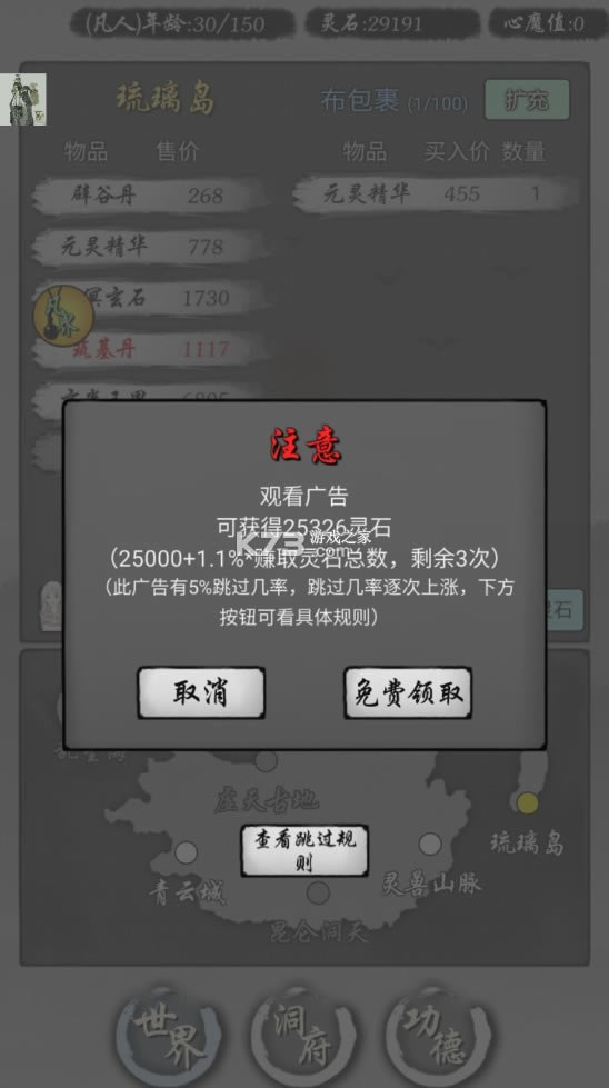 1、游历凡界,买卖修真奇宝,靠策略赚取灵石,提升境界。