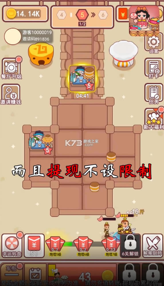 另外,左下角,还有个打卡,也可以做做。等到餐厅到达一定规模后,我们还可以扩建餐厅。继续招揽顾客,来获得红包。