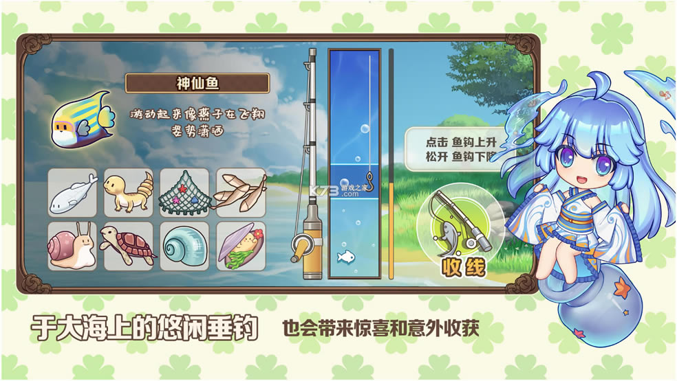 在湖边还能进行钓鱼,各种不同类型的小鱼,都能给你带来收益