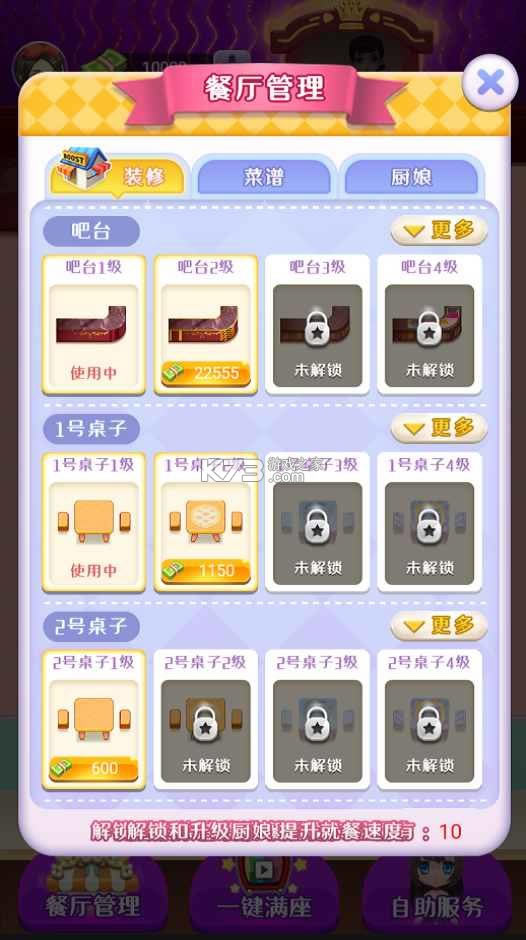 《富豪餐厅》一款非常有趣的模拟经营游戏,你将拥有一个梦寐以求的餐厅,你的目标就是建立各种良好信誉的饭店,不断的去研究各种菜品,满足不同顾客的需求,尽心尽力的照顾好每一位顾客。