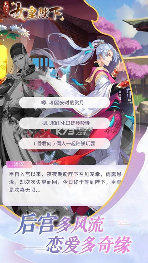 后宫侍君三千人,三千宠爱在谁身?各个时代、不同种族的美男穿越时间空间与成为女帝的您相会,他们的外貌、性格、喜好各不同,杀伐果断的大将白起、温柔深情的天使长米迦勒、蛮横霸道的阿育王、幽默吐槽的妖狐神乐……总有一款适合您。与侍君达到一定亲密度,更可以解锁他们的皮肤,欣赏心爱之人的全新面貌!