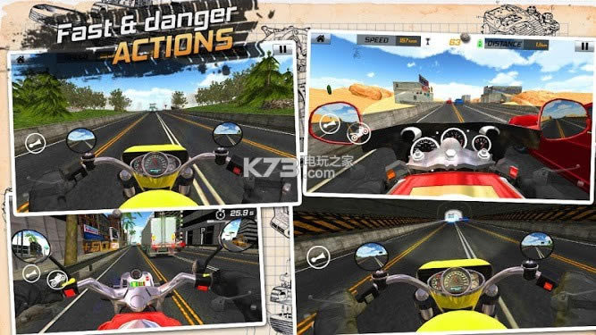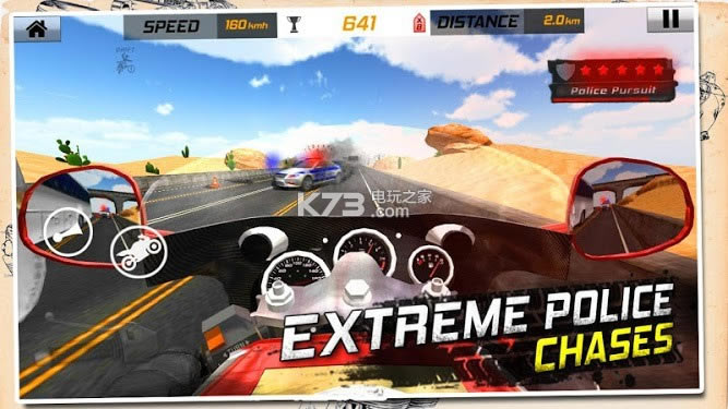 《交通骑手公路赛(Traffic Rider: Highway Race)》游戏以第一人称的视角为主,玩家可以自由的驾驶着摩托车在公路上行驶着,沿途不断的去超越前方的车辆,并注意躲避警车的追逐。