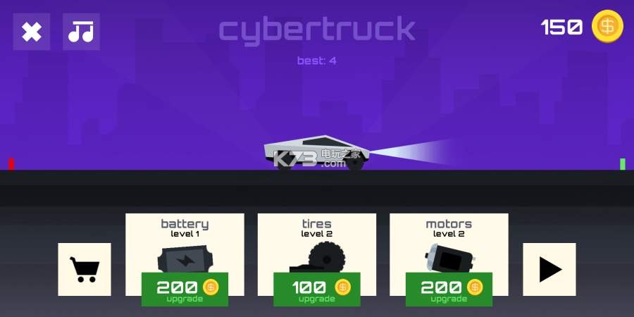 《Cybertruck》让玩家操控这款有着赛博朋克风格的电动汽车来挑战传统汽油车,Cybertruck游戏可以完成挑战获得金币,对车辆进行全方面的升级,以此来展现这辆超现实汽车的特点。