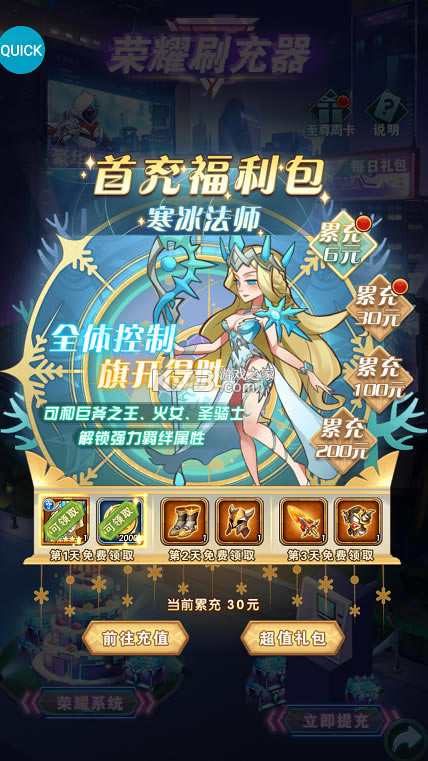 ★【创角福利】创角即送荣耀刷充器,余额无限存入,5星圣骑士开局,再送100元提款余额、满级VIP30、钻石*88888、金币*588888、经验水晶*588888