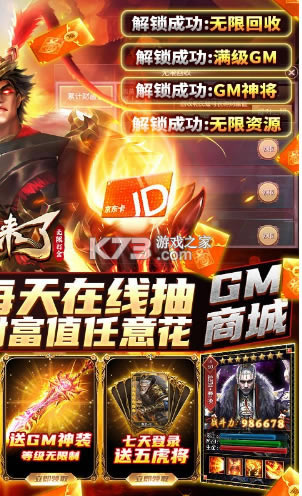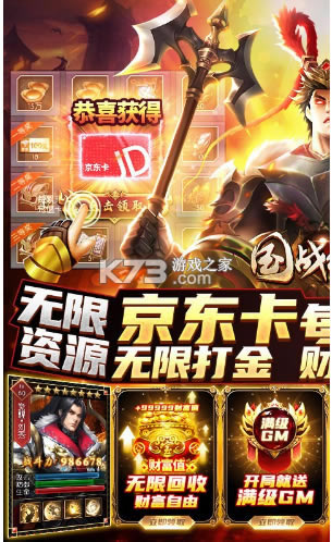 国战来了无限打金版是一款以三国为主题的角色扮演游戏。玩家一上线就送无限充值卡礼包、VIP 10、68888元宝、无限成长礼包。摧毁土匪充值卡,无限资源,升级送500万元宝。你将在三国领域,你将通过领导你的团队来争夺霸权。喜欢就来下载吧!