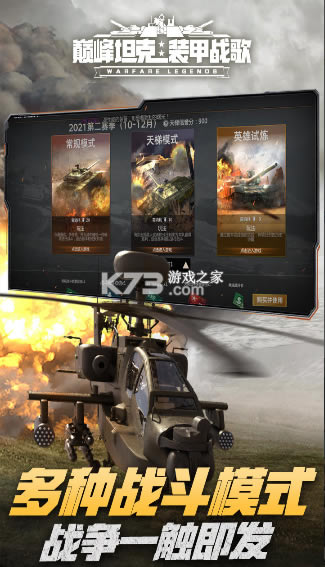 在武装直升机、主战坦克和装甲车间自由切换,体验陆地与天空三维一体化的全方位竞技模式,引入智能评级制度,为您自动匹配实力相近的对手,拒绝分房碾压。战场交锋,棋逢对手