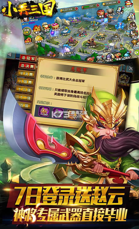《小兵三国-送万元真充》是一款三国策略手游。三国乱世,董卓专权。在十八路诸侯讨董之战中,你需要号召天下英雄,培养他们,并赢得他们的信任和追随,与他们共同上阵杀敌,争霸天下,问鼎三国!