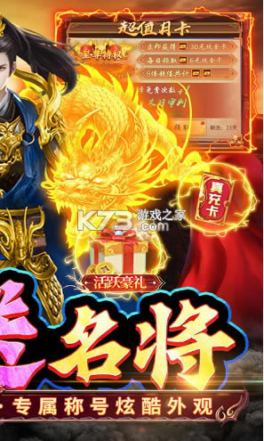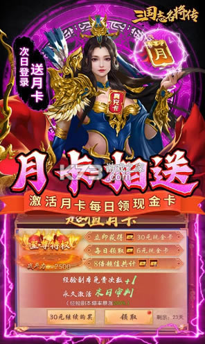 《三国志名将传》次月每日送30元月卡,每天送现金卡和高额的现金券,庞大的世界等你来冒险,跨服角逐一战成名,领取超级多的武器,搭配最神秘的挑战性,打造三国的场景,千人同屏挂机成长,给玩家们带来全新的挑战和冲击,体验三国的旅程。
