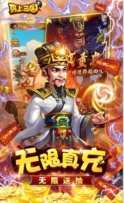 《马上三国-送GM无限充》是一款支持多人在线的三国RPG放置游戏。融合放置类游戏经典的同时还包含了丰富的游戏内容:放置、战斗、收集,养成、任务、竞技场等!战斗过程无需操作,阵容搭配充满策略性,游戏中还增加了独特武将进阶系统和战神无双,最强武将等独有玩法,玩家需要带领自己心仪的队伍去完成一统三国的霸业。