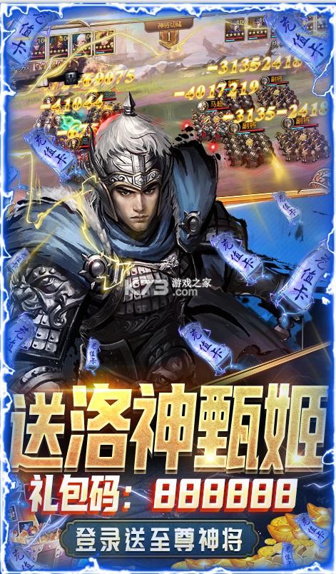 4.上线即送三重豪礼,“箭神黄忠”礼包码:666666,“洛神甄姬”礼包码:888888,“绝世美人”礼包码:999999